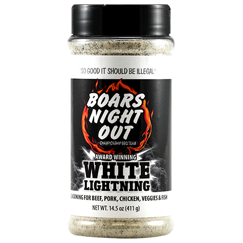 Boar's Night Out White Lightning Rub is so good it should be illegal. Great on beef, pork, chicken, veggies, and more. This is one of the top-selling and award-winning rubs on the market today.
