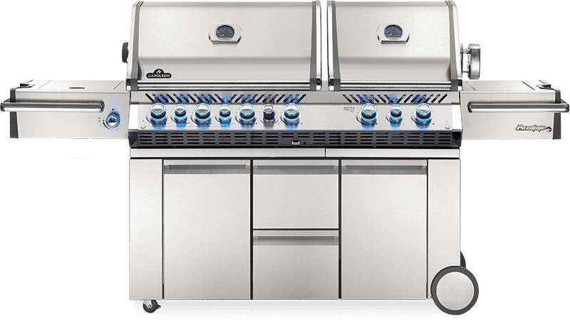 Napoleon's Prestige PRO™ 825 Propane Gas Grill with a Power Side Burner and Infrared Rear and Bottom Burners proves that two heads are better than one. On the outside, a shining stainless steel body provides durability against the elements while chrome details add luxury. The LED Spectrum NIGHT LIGHT™ Control Knobs have near limitless color options making night-time entertaining a breeze; they also glow red when the gas is left on as a safety feature. You'll know it's a Napoleon with the iconic WAVE™ cooking grids for those distinctive sear marks. The main grill head is big enough to grill for a crowd and provides loads of gas powered cooking, including turning your grill into a smoker with the integrated smoker tube and dedicated burner. The second head features two ceramic infrared burners that reach high heat in seconds, ideal for searing restaurant quality steaks. The Prestige PRO™ 825 also has a two-stage power side burner with a reversible cooking grid ideal for sauces, sautes and side dishes. Enjoy evenly cooked restaurant style meals with the rear infrared burners and rotisserie.