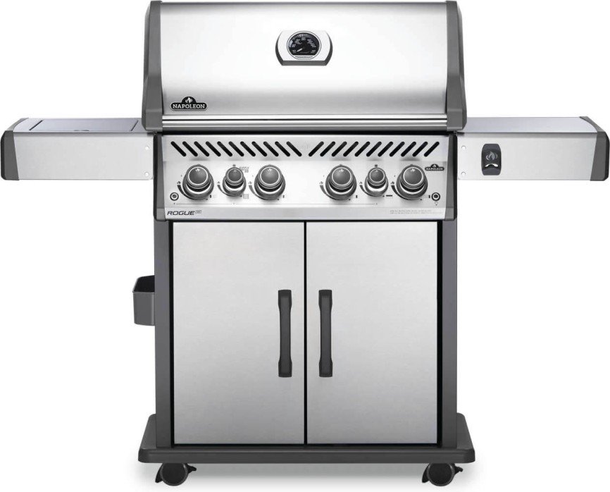 The Napoleon Rogue® SE 525 Stainless Steel Propane Gas Grill with Infrared Side Burner and Rear Burner is a durable stainless steel grill. Featuring five main burners, a rear rotisserie burner, and a high top lid, this grill has everything you need to create gourmet meals. Sear restaurant-style steaks on the integrated sear station, while generous side shelves provide plenty of prep space.