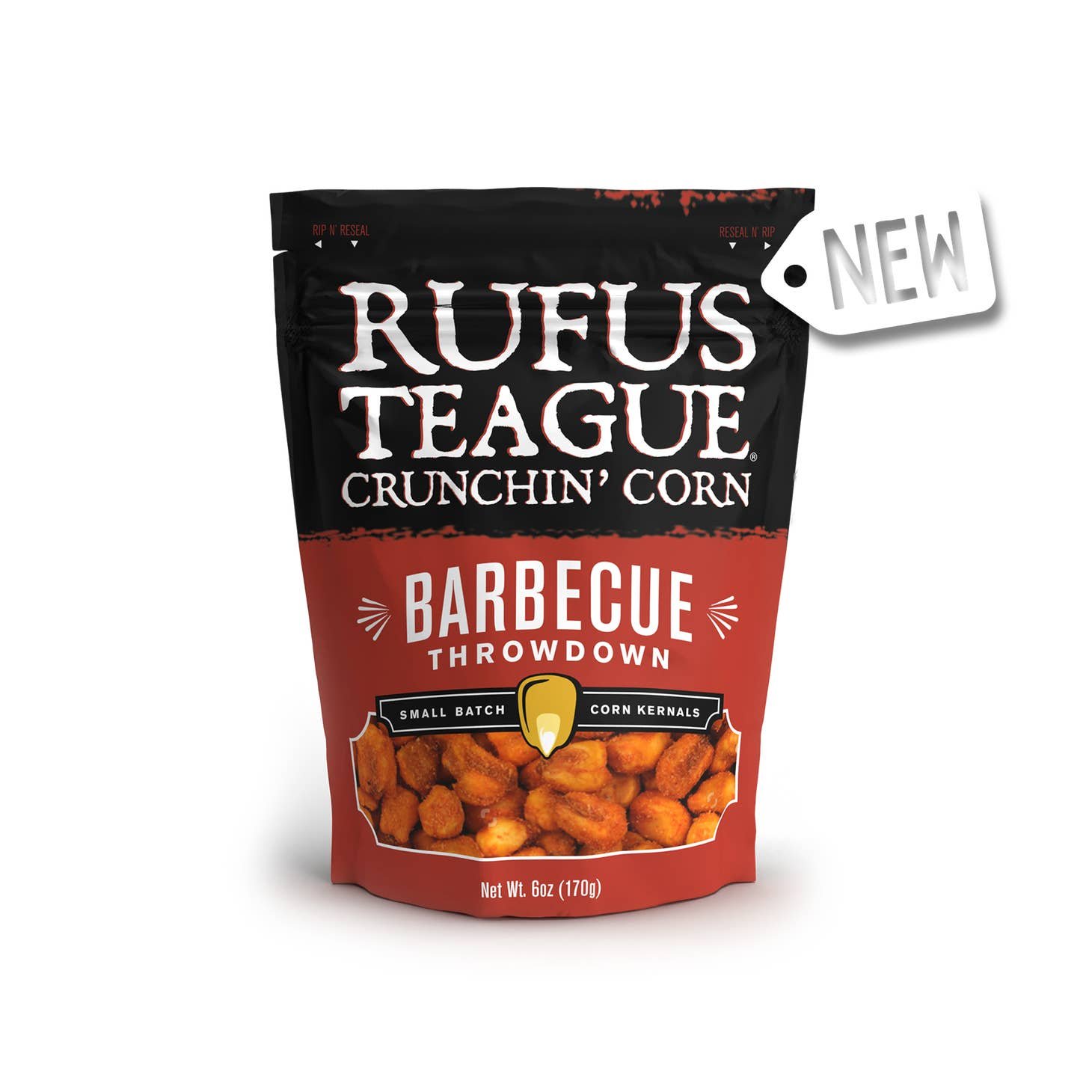Get a load of these monsters. Our crunchin' corns are the best in extra large, roasted corn kernals. Seasoned up with flavors only rufus knows how to concoct. You'll immediately know where the name bbq throwdown came from with one little taste. Smoky, savory, with a touch of sweetness, it's a flavor that's unmistakably rufus. Good luck putting these down. You're gonna need it.
